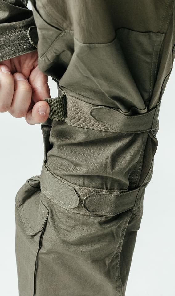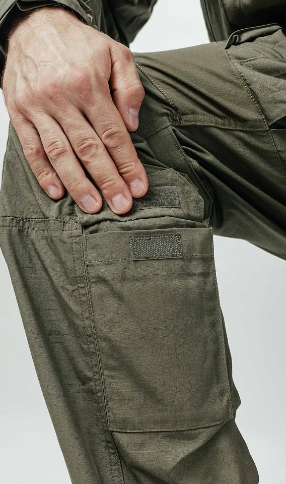 Современные тактические брюки конструируются не по прямым лекалам, как классические «шаровары». В зонах коленей, ластовицы (паха) и поясницы применяются специальные вытачки или вставки из эластичного материала (Спандекс/Кордура-стрейч).
