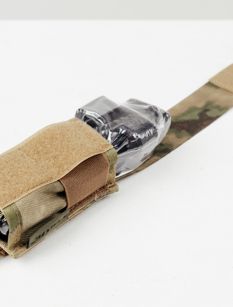 Широкая эластичная стропа опоясывает подсумок снаружи, надежно фиксируя турникет в готовом положении